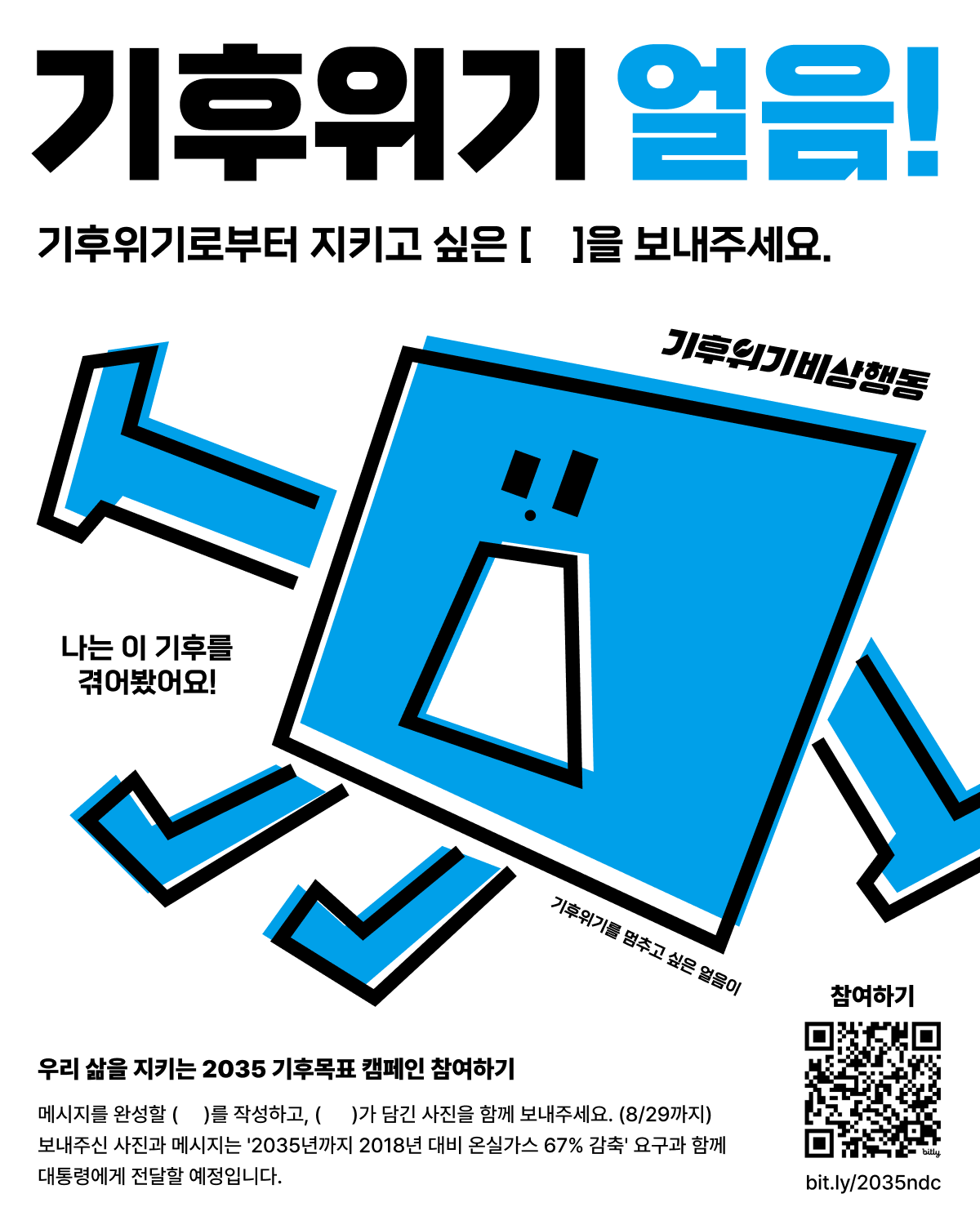 사랑하는 이와 함께 걷는 숲길🍃 생명력이 가득한 바다🐳 아이들의 웃음이 넘치는 놀이터🚲 농부의 작물이 잘 자라는 계절🌾 그리고 우리가 ‘함께’일 수 있는 미래까지🌈 기후위기를 멈추고,당신이 지키고 싶은 것은 무엇인가요?🧊 지금 정부는2035년까지의 국가 온실가스 감축목표(NDC)를 만들고 있어요.그 목표가 약하면, 2050년 탄소중립도 흔들리게 됩니다. 미래 세대의 부담은 커지고요.우리가 지켜야 할 2035 목표는 67% 감축.과학과 국제 기준이 말해주는 수치예요.우리 삶을 지키는 기후목표를 정하려면여러분의 참여가 필요해요. 함께해요!