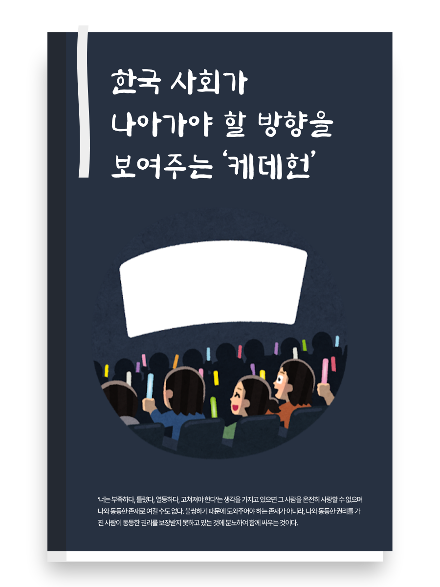 셀린이 한 말이 포용(또는 관용)을 떠오르게 한다. 우리 사회는 ‘포용 사회’라는 단어를 많이 쓰고 있다. 포용이라는 단어는 ‘따뜻하게 받아들여주는 느낌’이 있기 때문에 긍정적으로 여겨지며 널리 사용되고 있다. 그러나 포용이라는 용어는 권력 관계가 전제된 개념이다. 과연 누가 누구를 포용할 수 있을까? 소위 ‘정상인 사람’이 ‘비정상인 사람’을 너그러운 마음으로 받아주는 뉘앙스를 지울 수 없는 용어다. 남성이 여성을 포용해야 할까? 비성소수자가 성소수자를 포용해야 할까? 비장애인이 장애인을 포용해야 할까? 그렇지 않다. 특권그룹의 사람들이 억압그룹의 사람들을 포용해야 하는 게 아니라, 어느 누구도 자신이 가지고 있는 정체성만으로 배제(exclusion)되지 않는 모두가 동등한 주체로 포함(inclusion)되는 포함 사회(inclusive society)가 돼야 한다. 셀린과 루미의 대화를 통해 포용과 포함의 차이를 확인할 수 있다. ‘너는 부족하다, 틀렸다, 열등하다, 고쳐져야 한다’는 생각을 가지고 있으면 그 사람을 온전히 사랑할 수 없으며 나와 동등한 존재로 여길 수도 없다. 불쌍하기 때문에 도와주어야 하는 존재가 아니라, 나와 동등한 권리를 가진 사람이 동등한 권리를 보장받지 못하고 있는 것에 분노하여 함께 싸우는 것이다. 어느 누구도 정체성에 따른 권력 관계로 인해 배제를 경험하지 않을 수 있는 사회를 만드는 것만이 나를 포함한 모든 사람이 안전한 사회를 만들 수 있는 방법이기 때문이다.